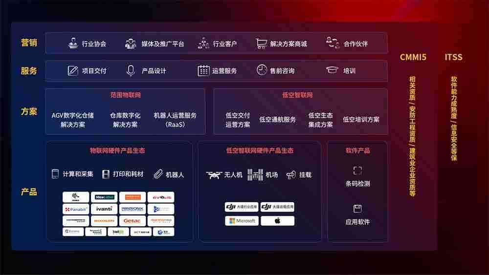 聚合国内外先进的物联网硬件产品品牌,,聚焦数字化仓储、、、机器人运营、、低空智联网等领域,,共同打造适合客户业务场景的解决方案并提供交付服务
