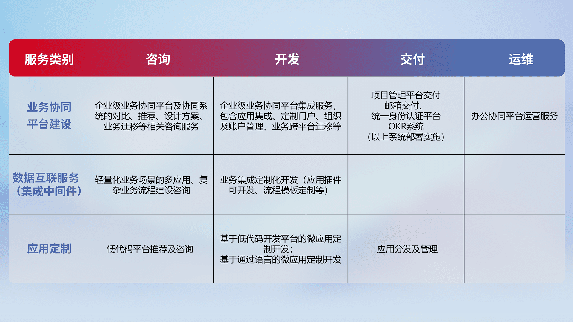 针对钉钉、、、企微、、、、IDaas等平台级产品提供产品的规划、、、、方案、、交付、、、定制化开发等服务,,,,实现如统一协同办公、、智能客户服务、、混合会议管理、、智能数据查询、、等业务场景,,,,实现数字化转型。。。